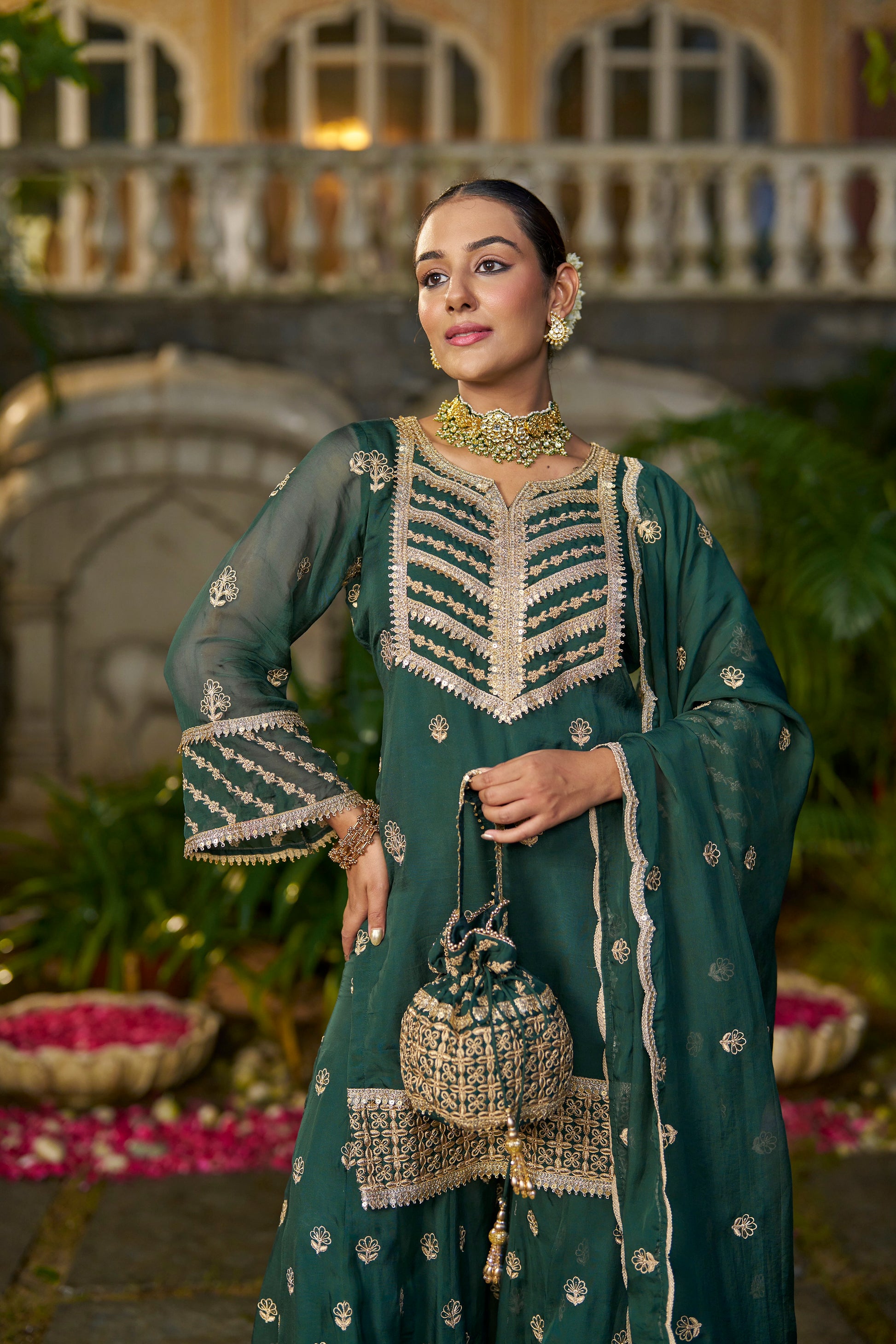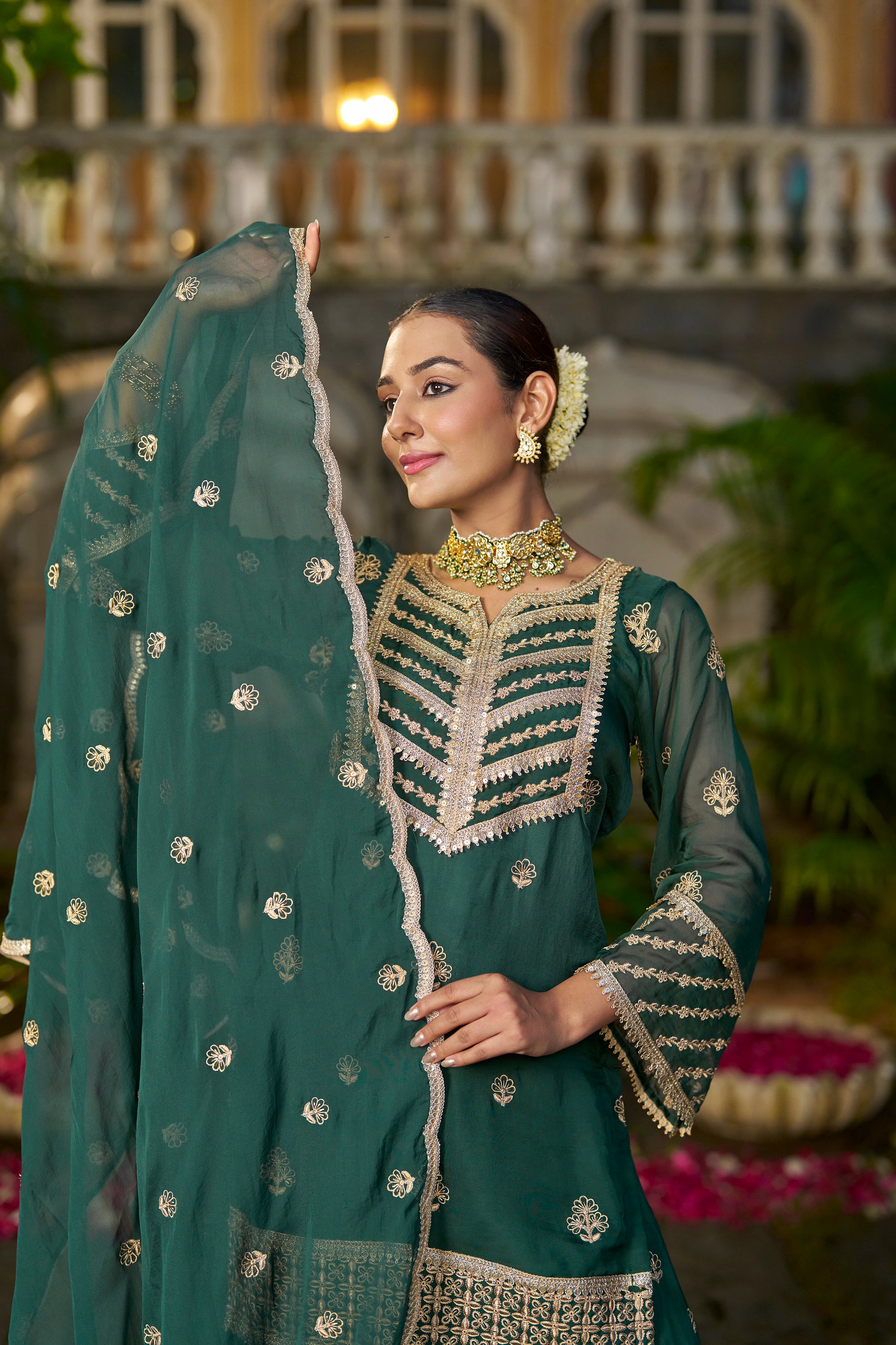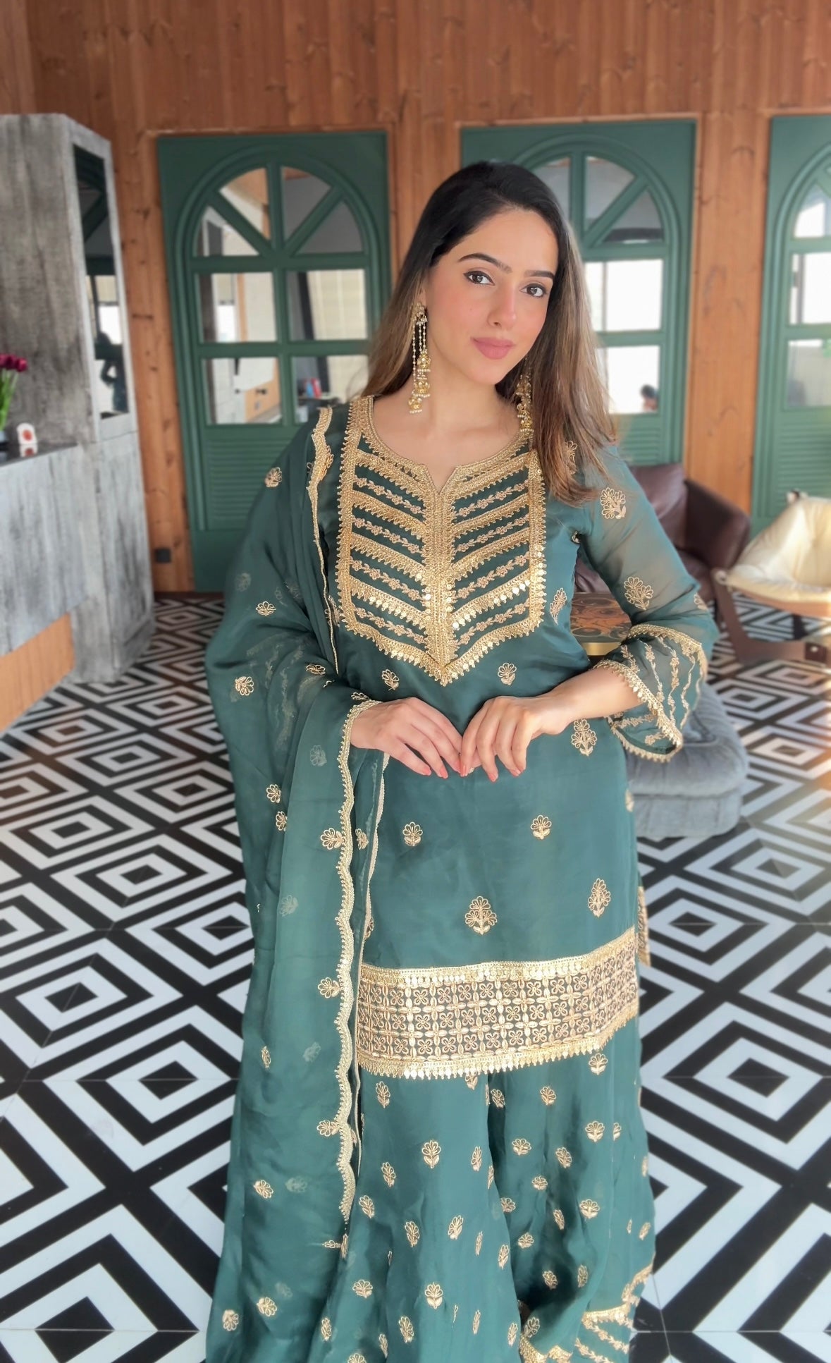 Radiate festive elegance in this bottle green pure viscose organza sharara suit set. The shirt is designed with an intricately embroidered neckline, adorned with delicate sequin lace and all-over embroidery on the body and sleeves. Embroidered borders with shimmering sequin lace accentuate the sleeve hems and ghera, adding a graceful charm. The ensemble is paired with a heavily embroidered pure viscose organza sharara, finished with sequin lace detailing at the hem for a luxurious touch. Completing the set is a pure viscose organza dupatta, beautifully finished with scalloped edges and four-sided sequin lace, making this outfit perfect for weddings, festivities, and grand celebrations.