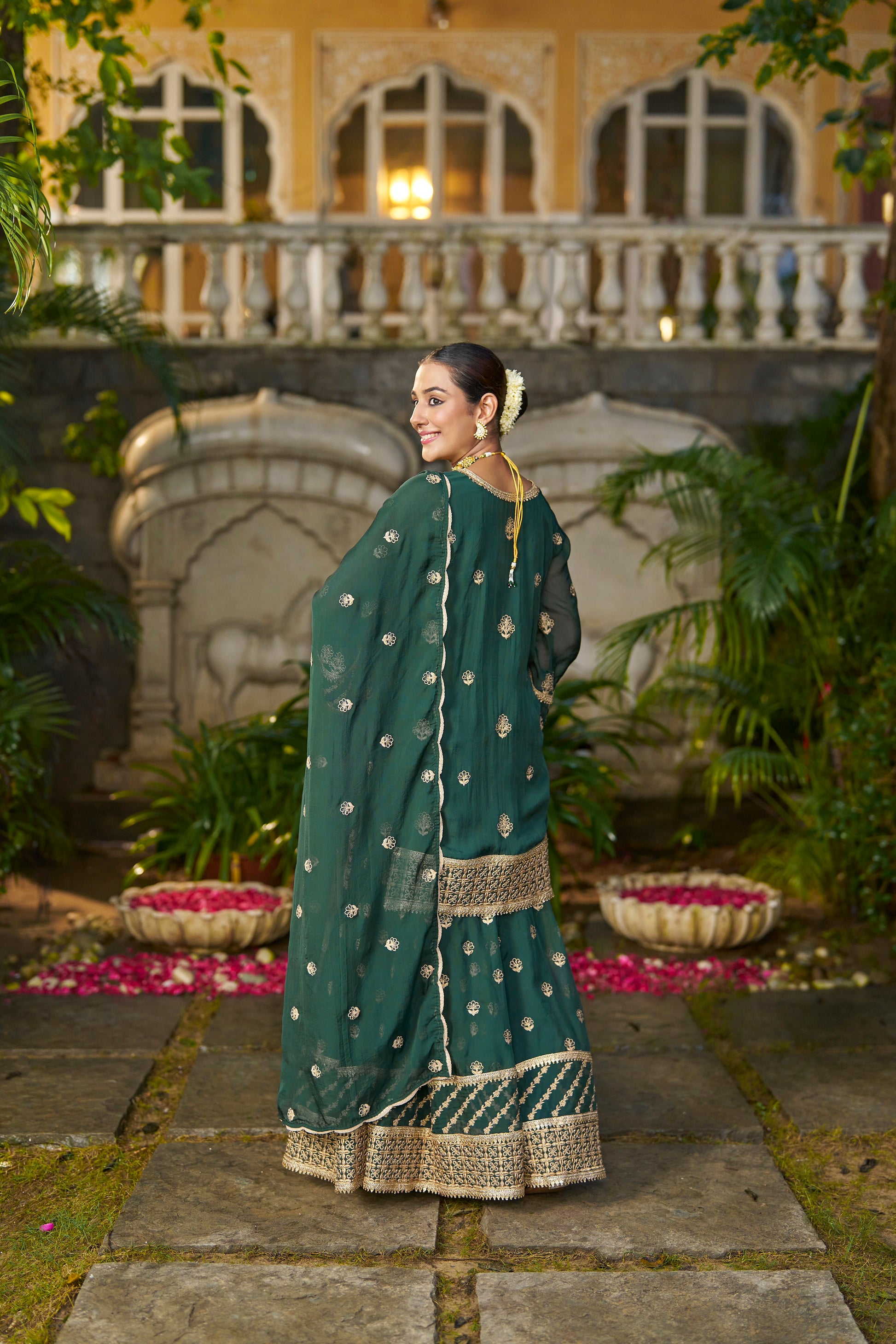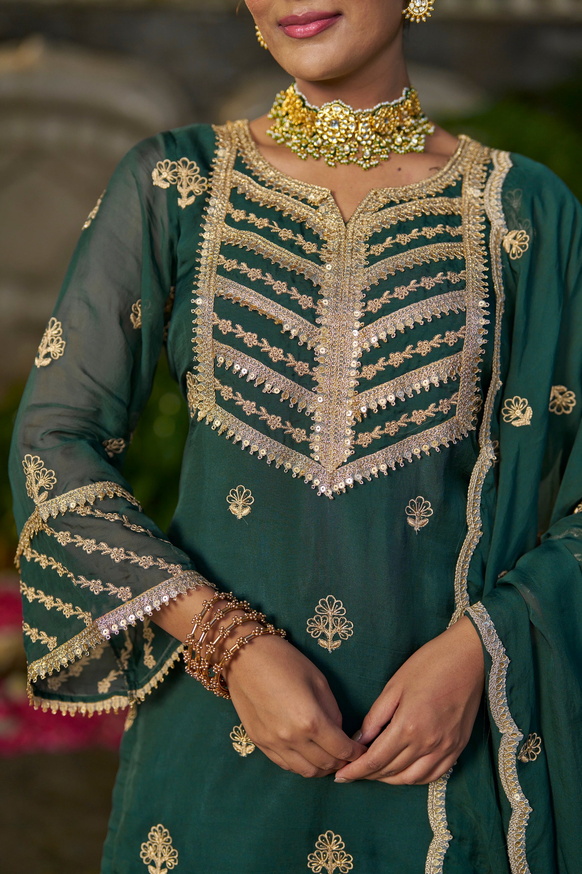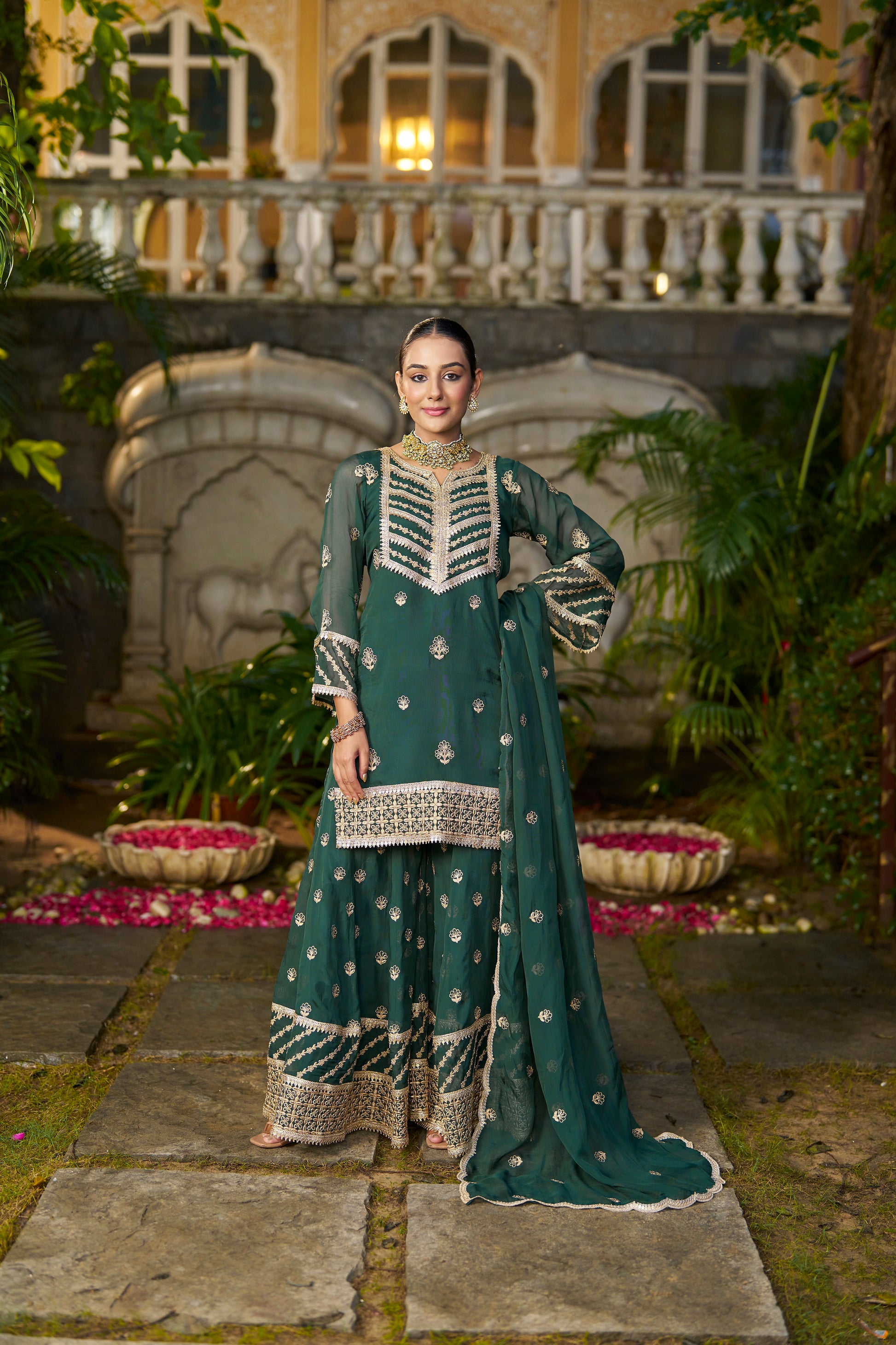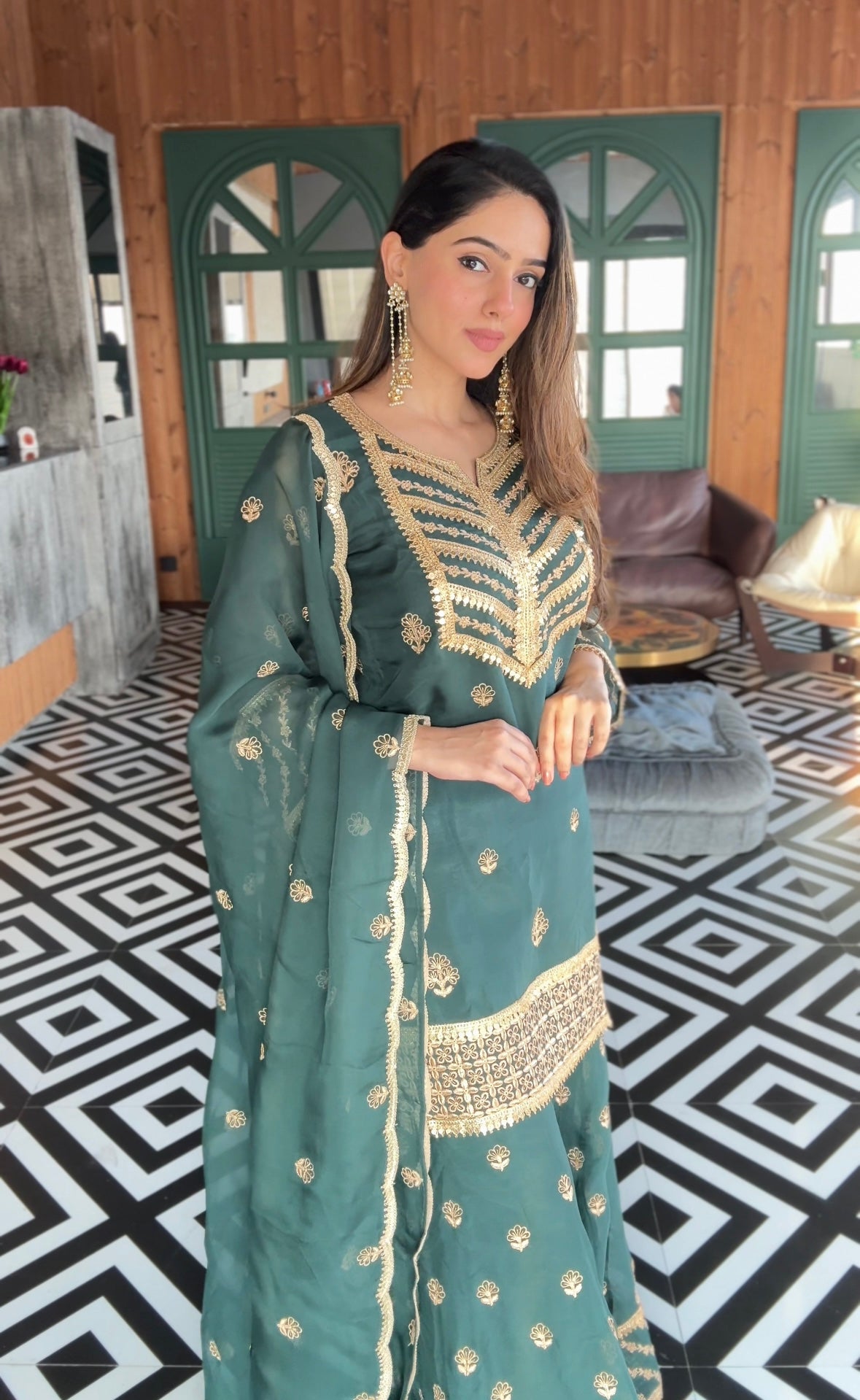 Radiate festive elegance in this bottle green pure viscose organza sharara suit set. The shirt is designed with an intricately embroidered neckline, adorned with delicate sequin lace and all-over embroidery on the body and sleeves. Embroidered borders with shimmering sequin lace accentuate the sleeve hems and ghera, adding a graceful charm. The ensemble is paired with a heavily embroidered pure viscose organza sharara, finished with sequin lace detailing at the hem for a luxurious touch. Completing the set is a pure viscose organza dupatta, beautifully finished with scalloped edges and four-sided sequin lace, making this outfit perfect for weddings, festivities, and grand celebrations.