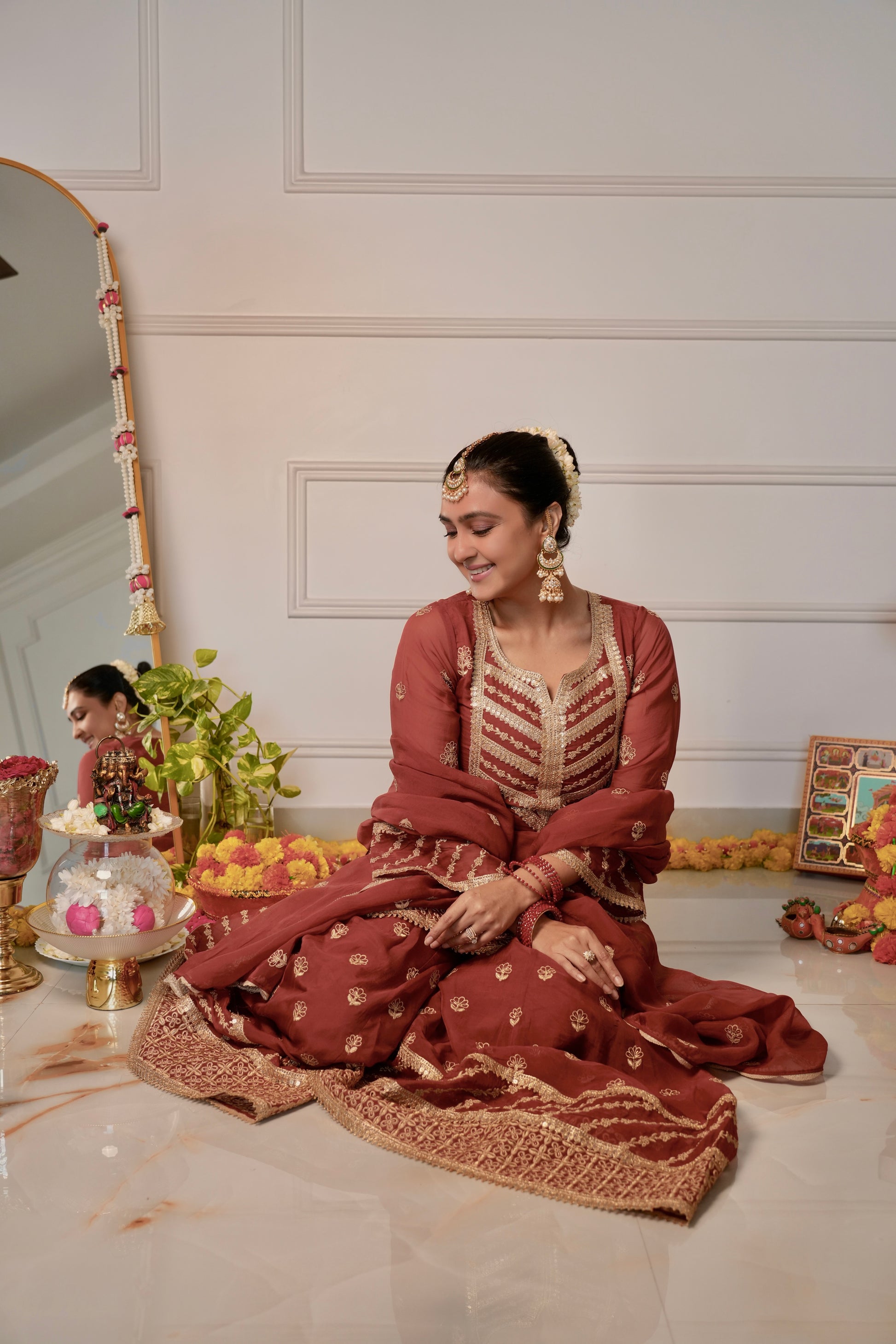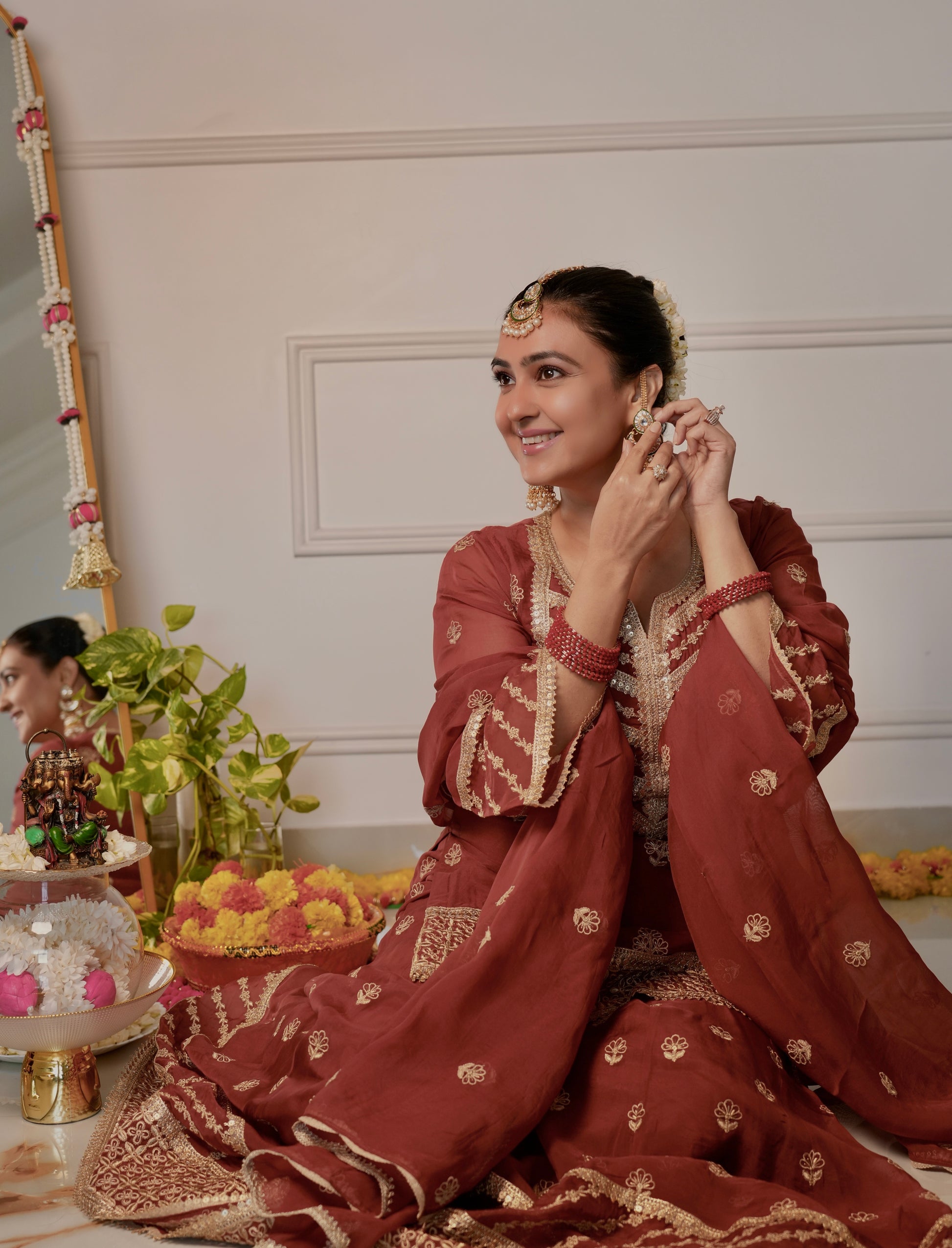 Divya Sabhlok in SIYAH - Rust Organza Sharara Set