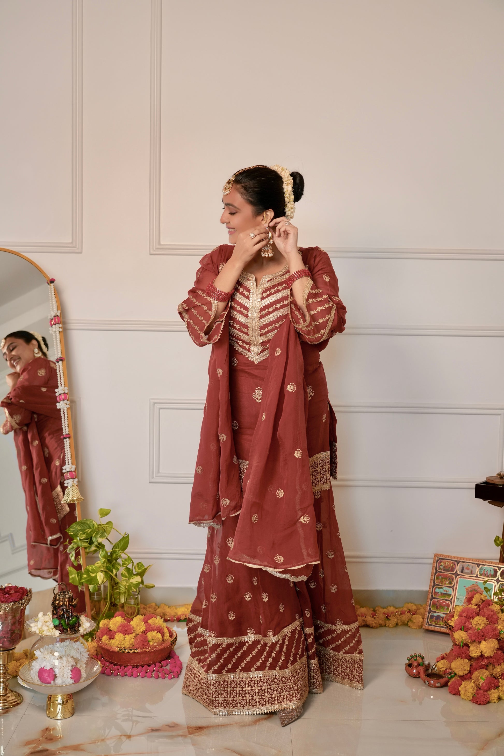 Radiate festive elegance in this rust red pure viscose organza sharara suit set. The shirt is designed with an intricately embroidered neckline, adorned with delicate sequin lace and all-over embroidery on the body and sleeves. Embroidered borders with shimmering sequin lace accentuate the sleeve hems and ghera, adding a graceful charm. The ensemble is paired with a heavily embroidered pure viscose organza sharara, finished with sequin lace detailing at the hem for a luxurious touch. Completing the set is a pure viscose organza dupatta, beautifully finished with scalloped edges and four-sided sequin lace, making this outfit perfect for weddings, festivities, and grand celebrations.