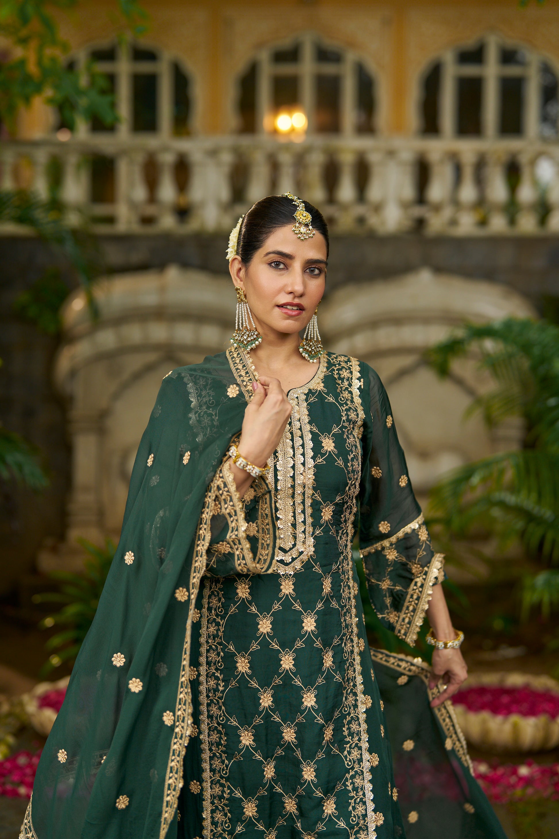 Embrace timeless sophistication with this bottle green A-line pure viscose organza suit set. The kurta is adorned with delicate thread embroidery across the shirt and sleeves, featuring a gracefully embellished neckline highlighted with dainty lace accents that enhance its regal appeal. Paired with coordinating straight pants that balance comfort and style, the look is completed with a stunning purple dupatta, beautifully bordered with intricate embroidery and finished with four-sided lace. Perfect for festive occasions, evening gatherings, or intimate celebrations, this ensemble blends elegance with effortless charm.