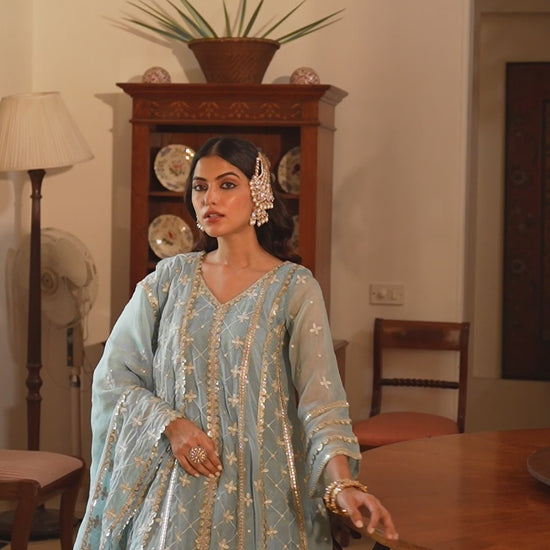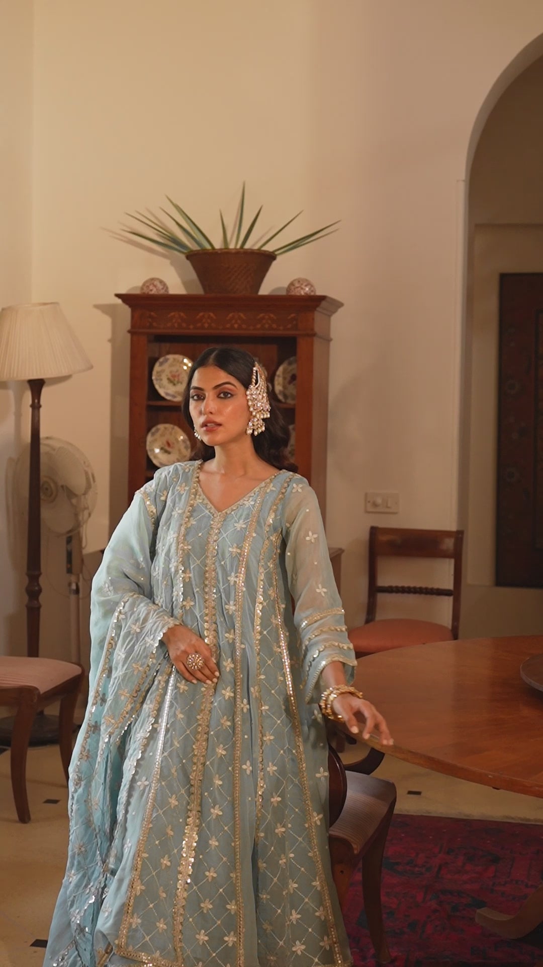 Indulge in the enchanting allure of this exquisite Anarkali kurta set, presented in a soft, ethereal vibrant blue hue reminiscent of a whimsical fairy tale. The V-neckline of the kurta is elevated by delicate sequin gota detailing, adding an air of refined elegance. Intricate floral and zari embroidery weave a narrative along the panels of the kurta, imbuing it with an undeniable charm. The straight pants, featuring an organza panel adorned with layers of exquisite gota work, provide a beautiful contrast to the flowing kurta. Completing this stunning ensemble is a matching dupatta that exudes understated sophistication, making it perfect for any formal occasion.