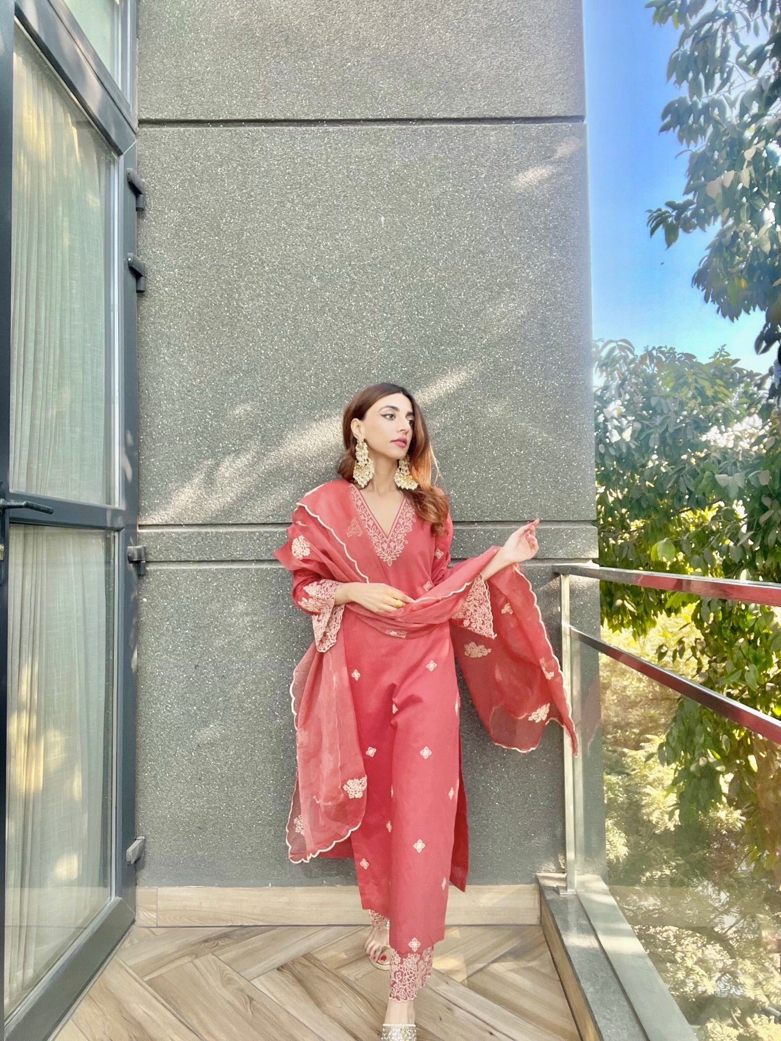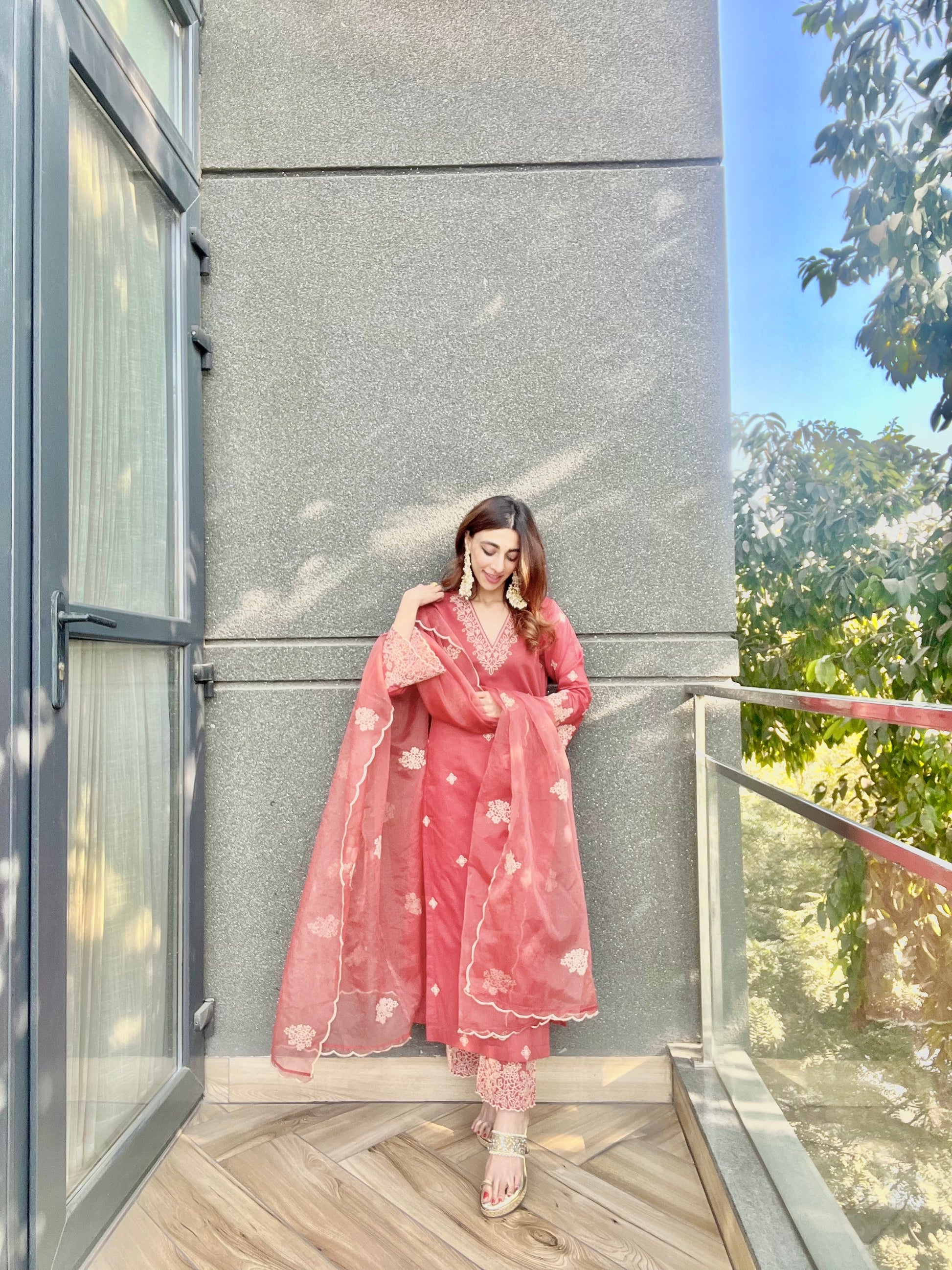 Chanderi silk straight fit kurta set with beautiful thread embroidery all over the kurta and with heavy embroidered Cut work Bell sleeves. Paired with chanderi silk pants with detailed embroidery. It comes with a beautiful organza Dupatta embellished with thread embroidery and four side cut work.