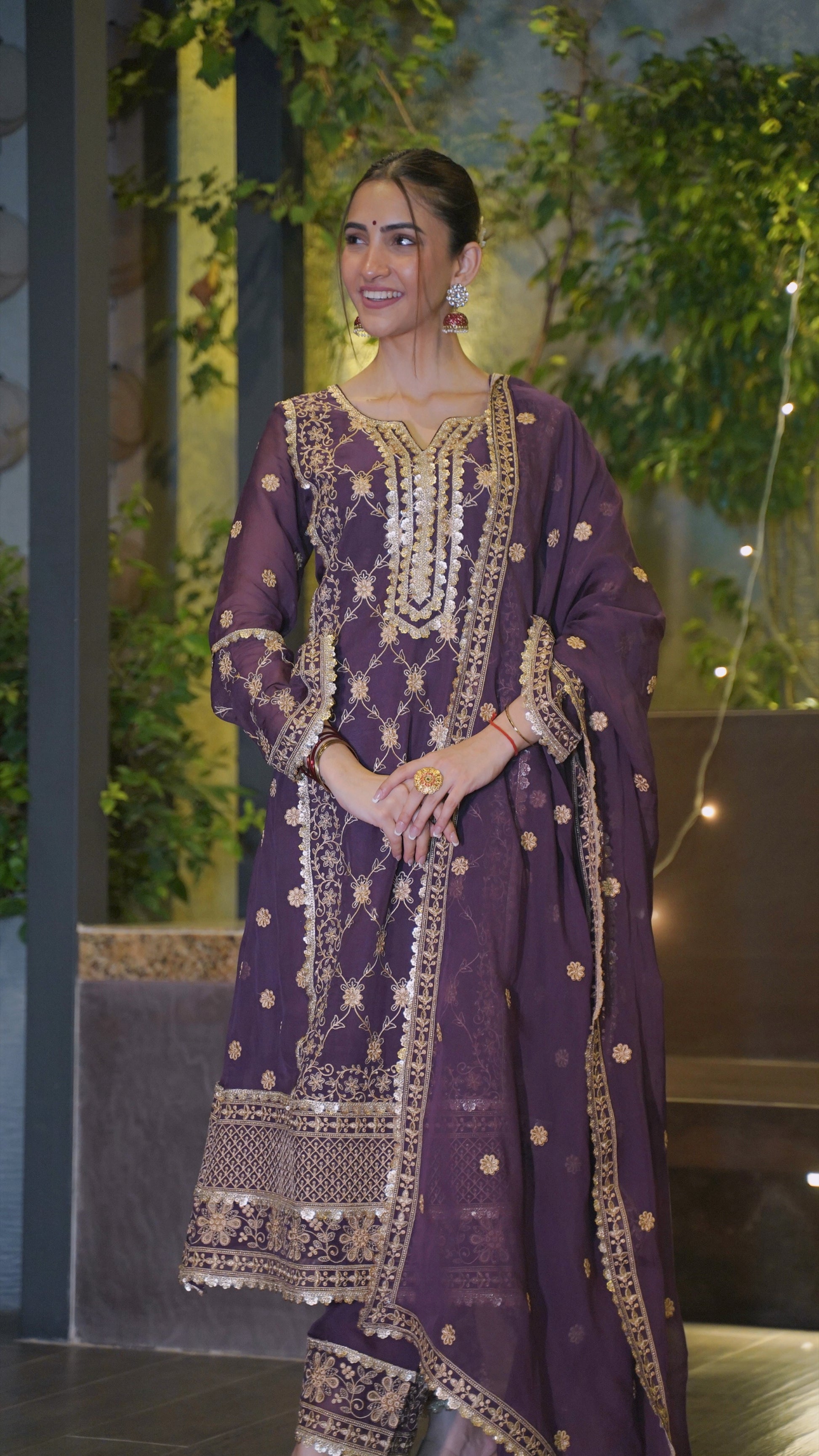 Embrace timeless sophistication with this purple A-line pure viscose organza suit set. The kurta is adorned with delicate thread embroidery across the shirt and sleeves, featuring a gracefully embellished neckline highlighted with dainty lace accents that enhance its regal appeal. Paired with coordinating straight pants that balance comfort and style, the look is completed with a stunning purple dupatta, beautifully bordered with intricate embroidery and finished with four-sided lace. Perfect for festive occasions, evening gatherings, or intimate celebrations, this ensemble blends elegance with effortless charm.