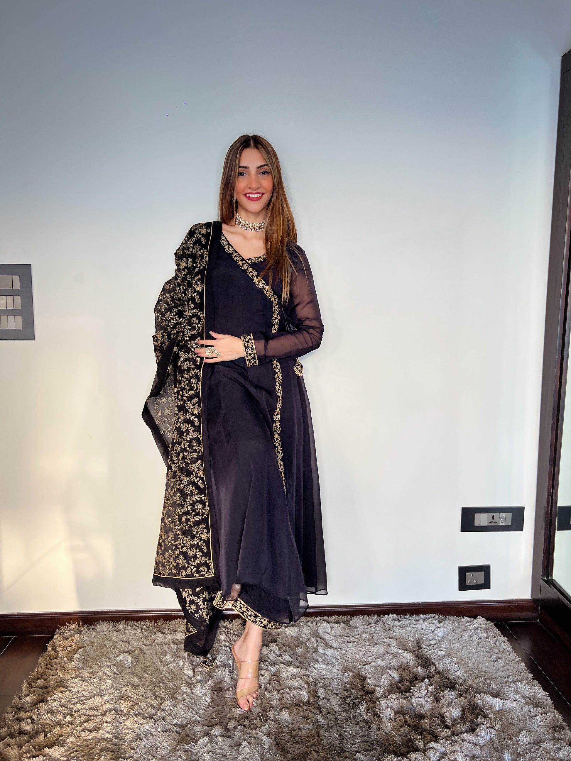 Featuring a Black Angrakha Anarkali Suit Set. The pure organza top has a delicate zari embroidery and highlight of gold sequins, adding a perfect bling to the garment. Ideal for a special occasion, it is paired with matching pants with zari embroidery on the edges and a heavy embroidered dupatta with sequin highlighting.