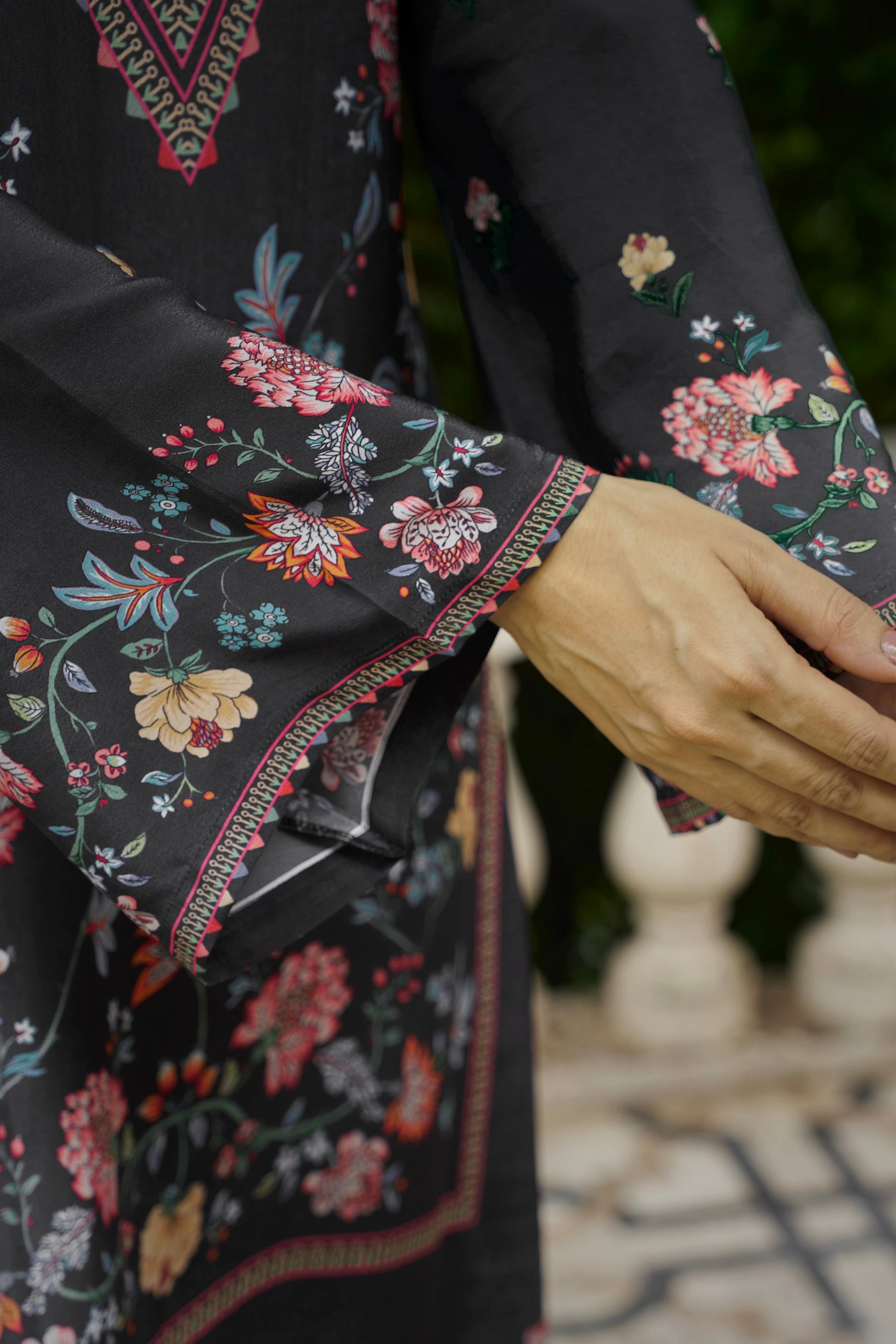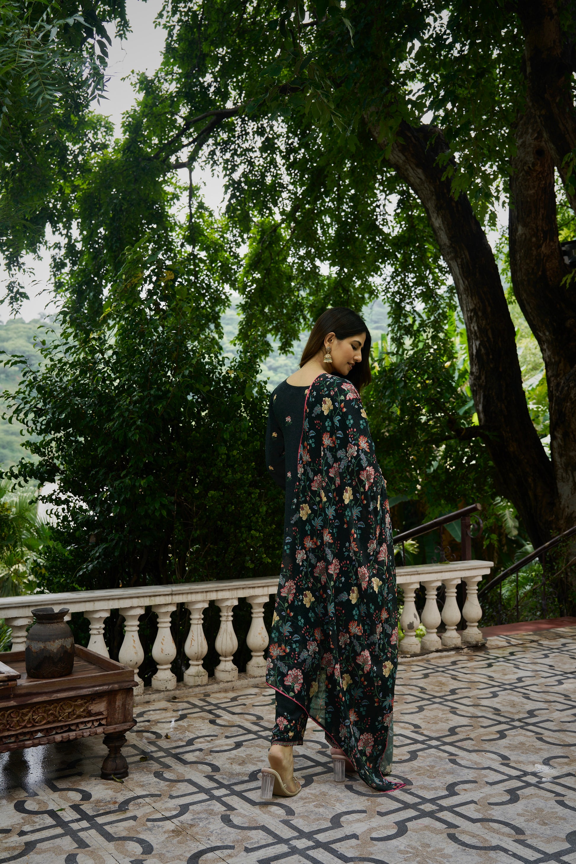 Radiate elegance in this grey digital print suit set, designed with a graceful printed neckline and floral printed panels spread all over the shirt. The look is elevated with a printed border along the hem of the ghera and sleeves, adding a touch of definition. The matching pants carry the same printed border for a coordinated finish. Paired with a lightweight chinnon chiffon dupatta adorned with delicate floral prints, this ensemble is a perfect blend of sophistication and charm for festive and special occasions.