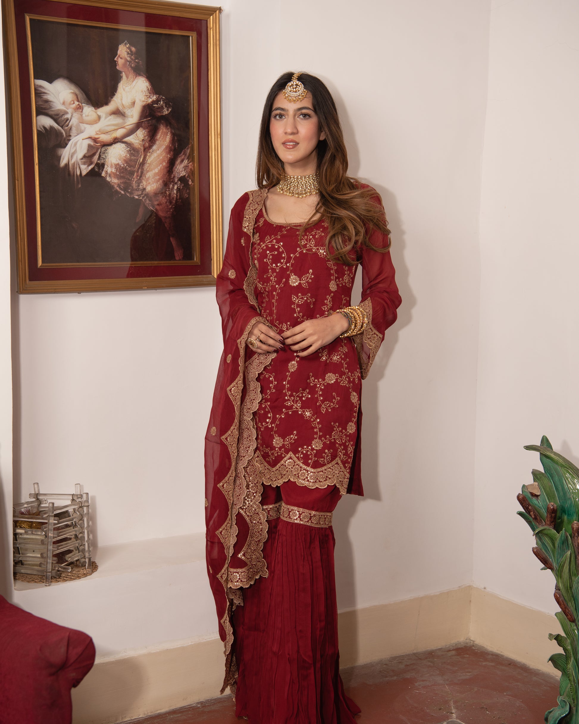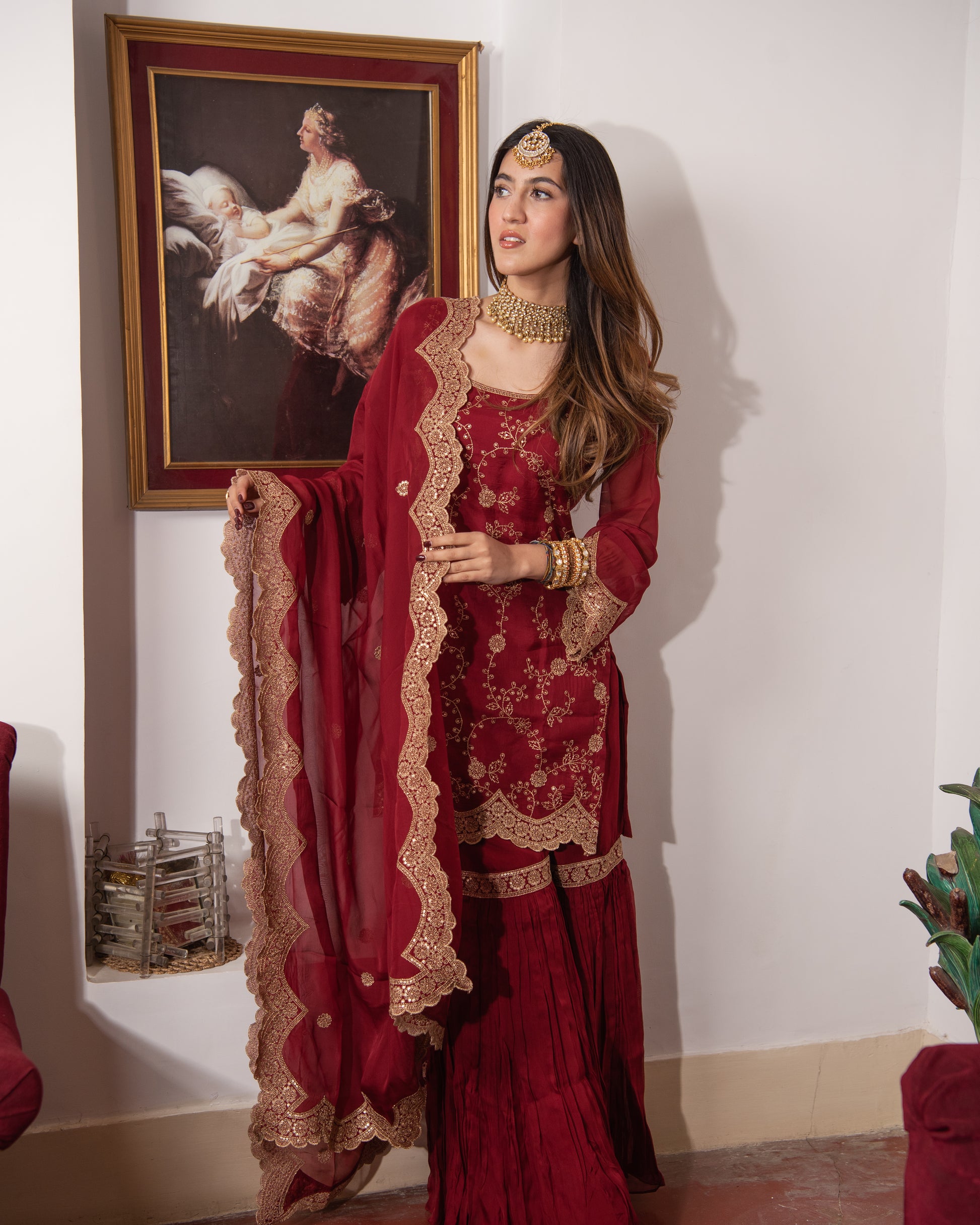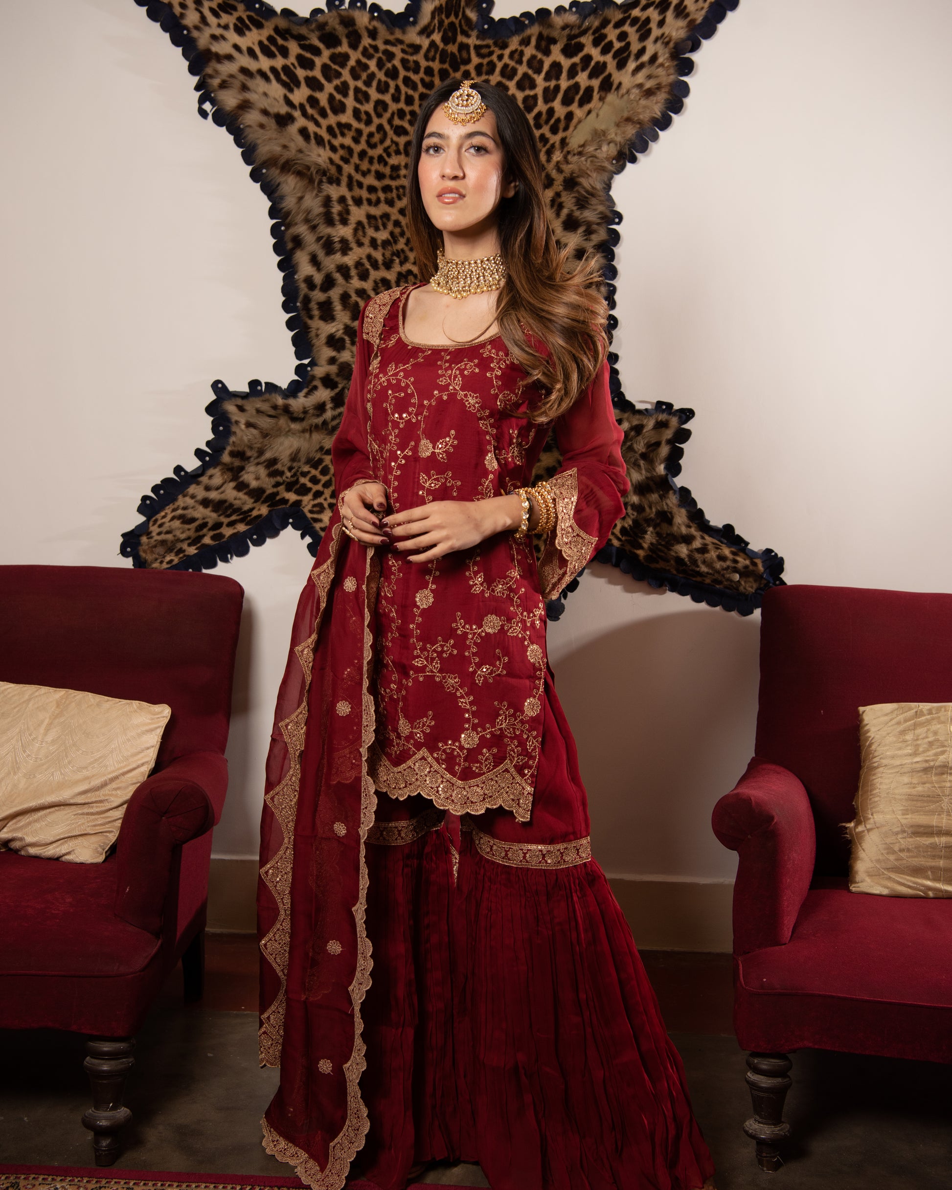Featuring a Maroon Sharara set. The pure organza top has heavy zari embroidery on all over with highlight of gold sequins and a zari embroidered cut work border on the ghera, adding a perfect bling to the garment. Ideal for a special occasion, it is paired with a matching sharara and a fully zari embroidered dupatta with a four side cut work border.